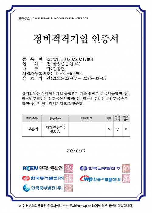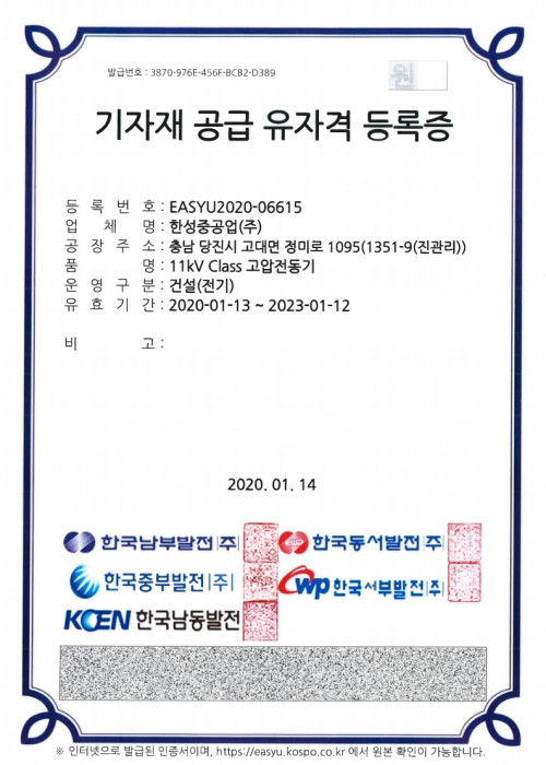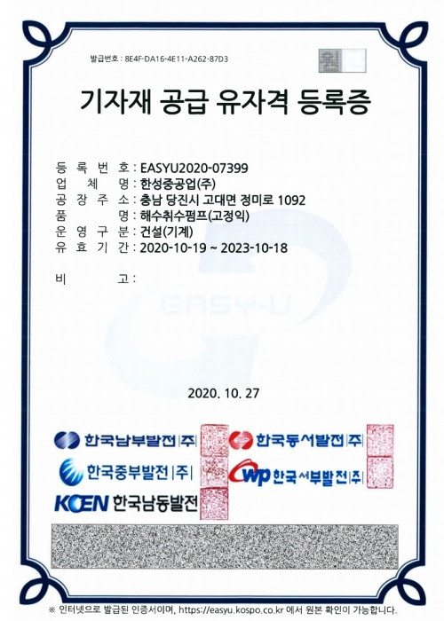 한강수력본부 공급자 등록증