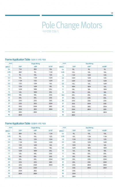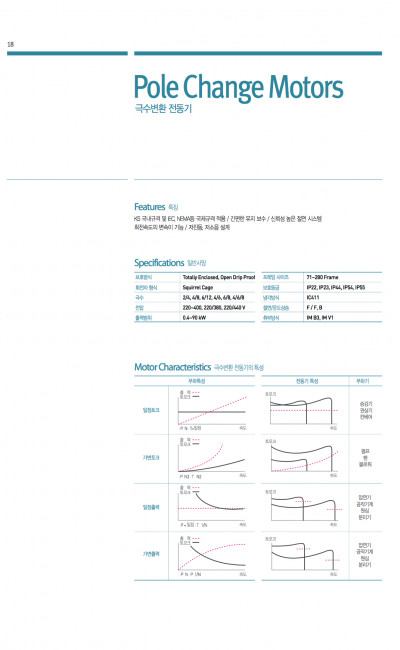 KS 국내규격 및 IEC, NEMA등 국제규격 적용 / 간편한 유지 보수 / 신뢰성 높은 절연 시스템 회전속도의 변속이 가능 / 저진동, 저소음 설계