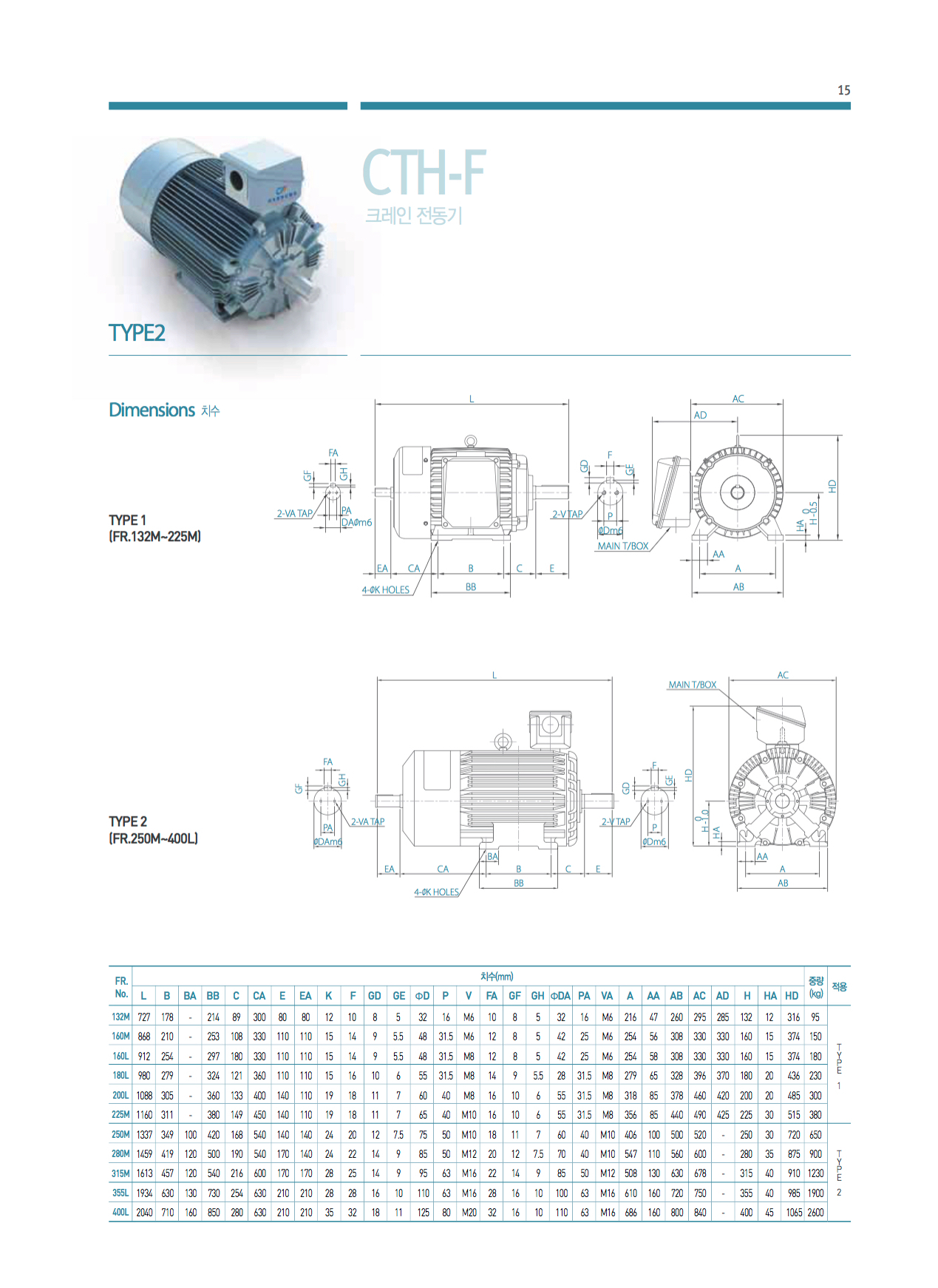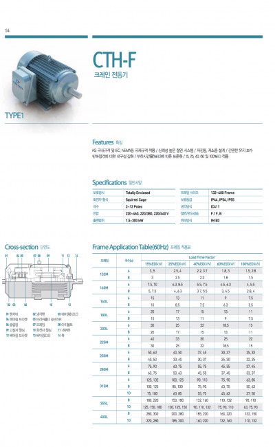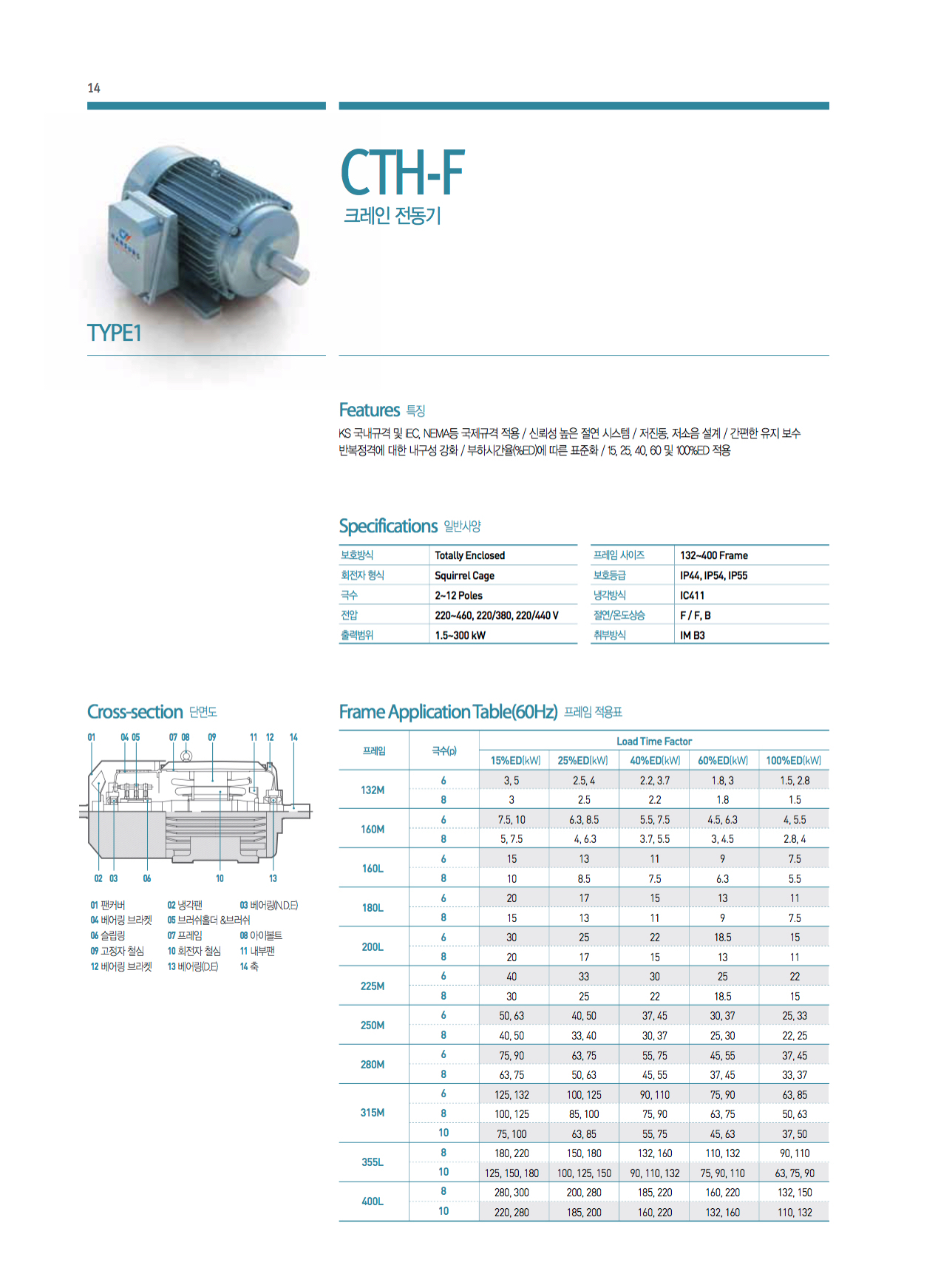 KS 국내규격 및 IEC, NEMA등 국제규격 적용 / 신뢰성 높은 절연 시스템 / 저진동, 저소음 설계 / 간편한 유지 보수 반복정격에 대한 내구성 강화 / 부하시간율(%ED)에 따른 표준화 / 15, 25, 40, 60 및 100%ED 적용
