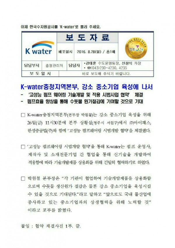 한성중공업 한국수자원공사와 "고성능 펌프 웨어링 기술개발 및 적용 시범사업 협약" 체결 한성중공업 0 16690 2016.08.30 08:11 한성중공업과 한국수자원공사(K-water)는 2016년 8월 28일 기존 사용중인 펌프에 신규부품(웨어링등)을 적용하여 펌프의 효율을 극대화 하는 프로젝트를 진행키로 하였다. 펌프 운영사와 제작사 및 소재전문기업간 협업을 통하여 신기술을 개발하여 적용함에 따라 기술개발제품의 상용화를 실현하고 사용자 편의와 고효율 제품 사용에 따른 원가절감(수돗물생산 등)으로 산업경제에도 이바지할 계획이다. 관련기사 첨부자료 참조